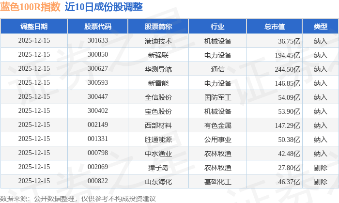 近10日内蓝色100R(480068)指数成份股做了调整,新纳入了9只股票,剔除了2只股票。