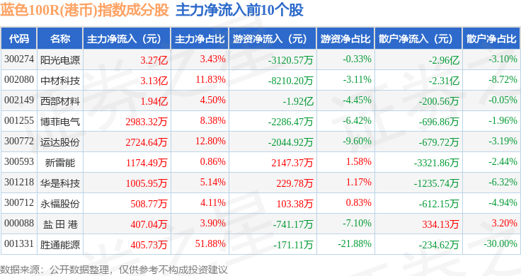 资金流向方面,蓝色100R(港币)(480069)指数成份股当日主力资金净流出合计5.6亿元,游资资金净流出合计4.2亿元,散户资金净流入合计9.8亿元。成份股资金流向详情见下表:
