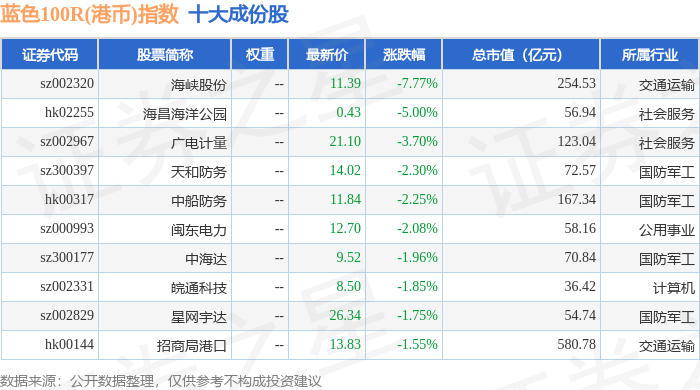 蓝色100R(港币)(480069)指数十大成份股详情如下: