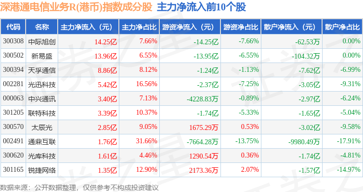 资金流向方面,深港通电信业务R(港币)(483030)指数成份股当日主力资金净流入合计40.02亿元,游资资金净流出合计32.13亿元,散户资金净流出合计7.88亿元。成份股资金流向详情见下表: