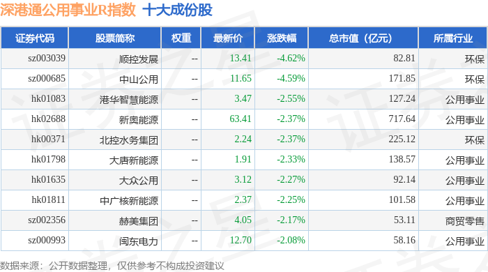 深港通公用事业R(483031)指数十大成份股详情如下: