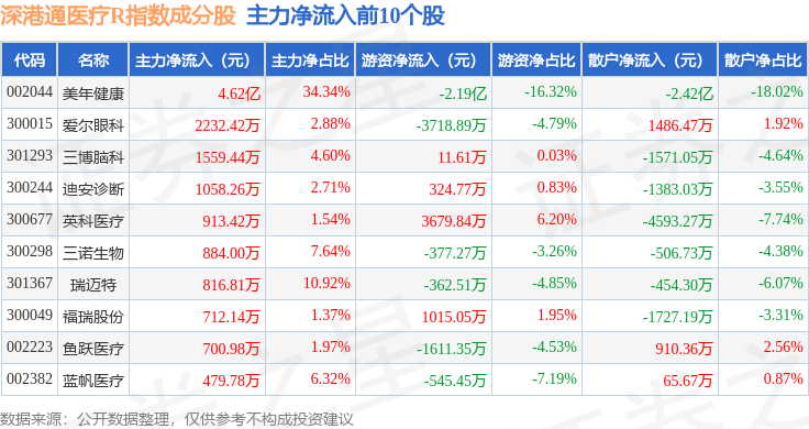资金流向方面,深港通医疗R(483035)指数成份股当日主力资金净流入合计4.56亿元,游资资金净流出合计2.49亿元,散户资金净流出合计2.07亿元。成份股资金流向详情见下表:
