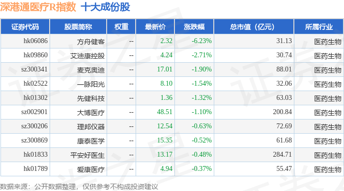 证券之星消息,12月17日,深港通医疗R(483035)指数报收于4900.38点,涨1.7%,成交90.28亿元,换手率1.15%。当日该指数成份股中,上涨的有42家,美年健康以10.06%的涨幅领涨,下跌的有14家,方舟健客以6.23%的跌幅领跌。
