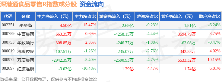 资金流向方面,深港通食品零售R(483037)指数成份股当日主力资金净流入合计1.26亿元,游资资金净流出合计2.12亿元,散户资金净流入合计8637.15万元。成份股资金流向详情见下表: