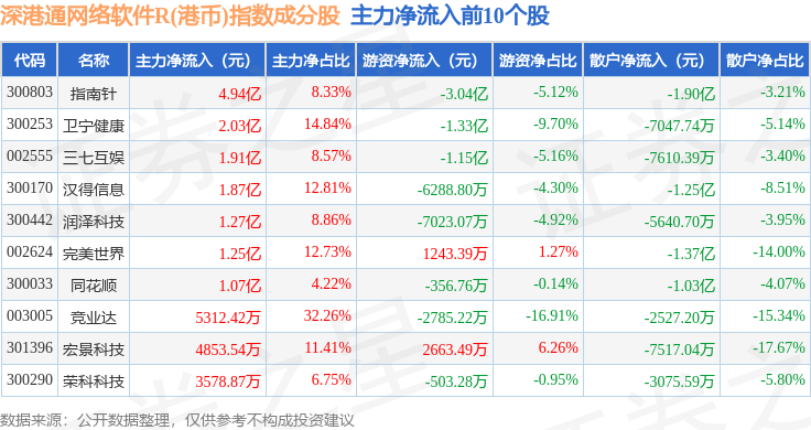 资金流向方面,深港通网络软件R(港币)(483048)指数成份股当日主力资金净流入合计1997.72万元,游资资金净流出合计8.47亿元,散户资金净流入合计8.27亿元。成份股资金流向详情见下表: