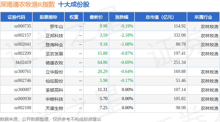 深港通农牧渔R(483051)指数十大成份股详情如下: