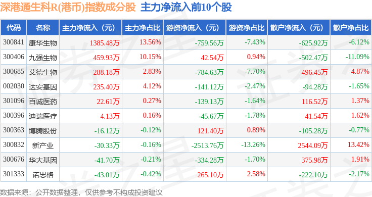 资金流向方面,深港通生科R(港币)(483060)指数成份股当日主力资金净流出合计2.25亿元,游资资金净流出合计1.3亿元,散户资金净流入合计3.54亿元。成份股资金流向详情见下表: