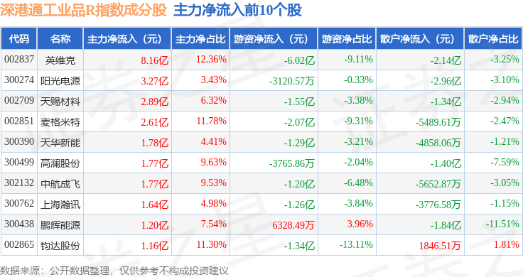 资金流向方面,深港通工业品R(483069)指数成份股当日主力资金净流出合计15.01亿元,游资资金净流出合计27.0亿元,散户资金净流入合计42.0亿元。成份股资金流向详情见下表: