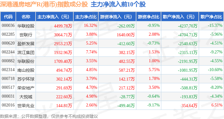 资金流向方面,深港通房地产R(港币)(483072)指数成份股当日主力资金净流出合计1.55亿元,游资资金净流入合计7709.26万元,散户资金净流入合计7819.95万元。成份股资金流向详情见下表: