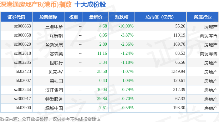 深港通房地产R(港币)(483072)指数十大成份股详情如下: