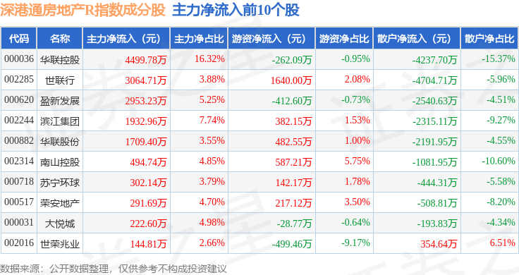 资金流向方面,深港通房地产R(483071)指数成份股当日主力资金净流出合计1.55亿元,游资资金净流入合计7709.26万元,散户资金净流入合计7819.95万元。成份股资金流向详情见下表: