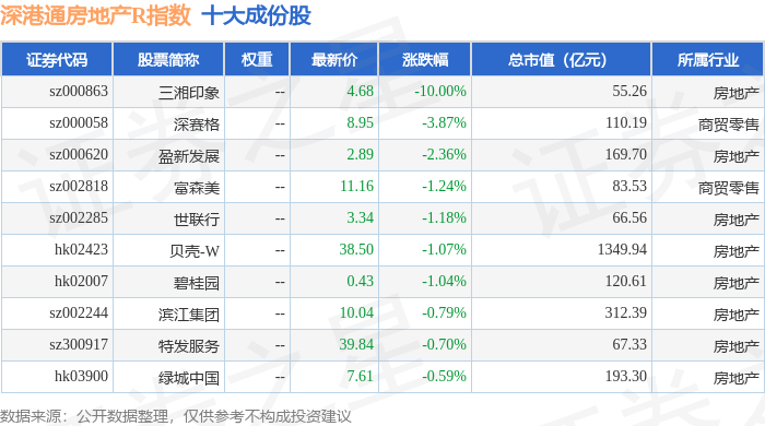 证券之星消息,12月17日,深港通房地产R(483071)指数报收于3256.54点,涨0.04%,成交93.93亿元,换手率0.74%。当日该指数成份股中,上涨的有34家,华联控股以3.5%的涨幅领涨,下跌的有26家,三湘印象以10.0%的跌幅领跌。