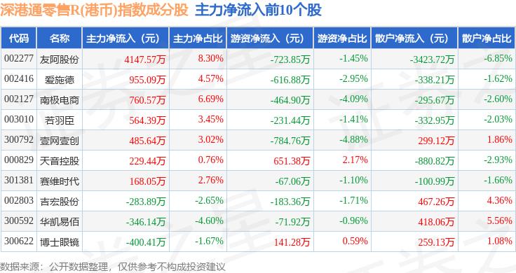 资金流向方面,深港通零售R(港币)(483074)指数成份股当日主力资金净流出合计2.02亿元,游资资金净流入合计5226.69万元,散户资金净流入合计1.5亿元。成份股资金流向详情见下表: