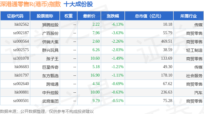深港通零售R(港币)(483074)指数十大成份股详情如下:
