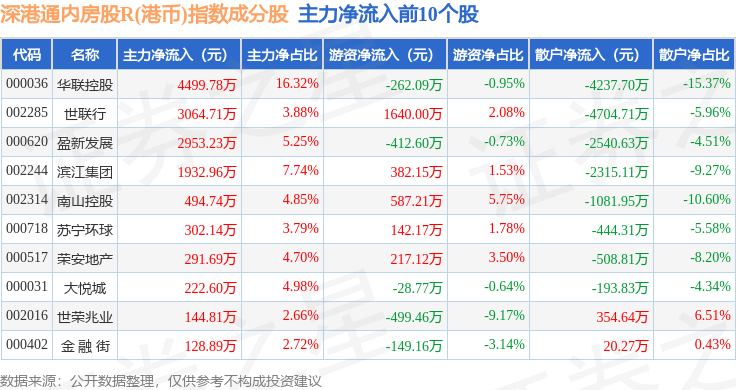 资金流向方面,深港通内房股R(港币)(483084)指数成份股当日主力资金净流出合计5873.89万元,游资资金净流入合计3440.9万元,散户资金净流入合计2432.99万元。成份股资金流向详情见下表: