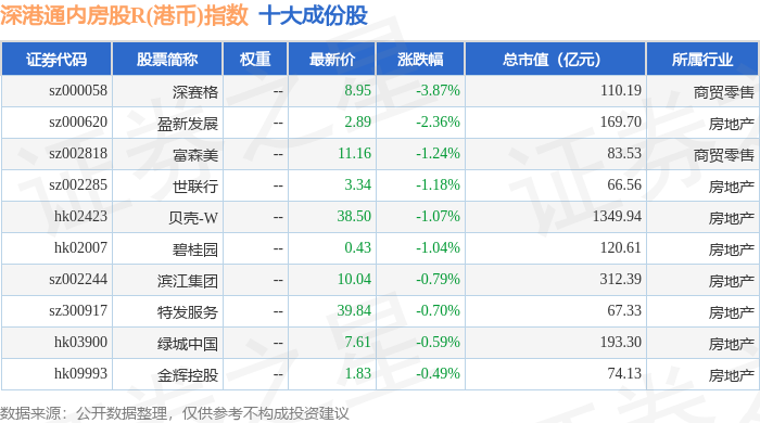 深港通内房股R(港币)(483084)指数十大成份股详情如下: