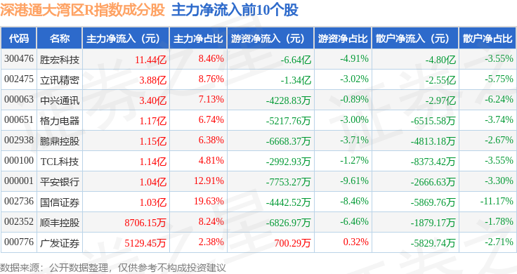 资金流向方面,深港通大湾区R(483089)指数成份股当日主力资金净流入合计24.53亿元,游资资金净流出合计11.75亿元,散户资金净流出合计12.77亿元。成份股资金流向详情见下表: