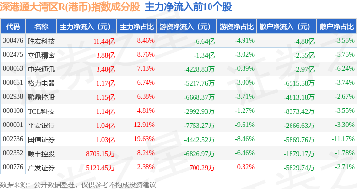 资金流向方面,深港通大湾区R(港币)(483090)指数成份股当日主力资金净流入合计24.53亿元,游资资金净流出合计11.75亿元,散户资金净流出合计12.77亿元。成份股资金流向详情见下表: