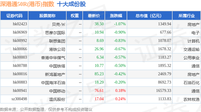 深港通50R(港币)(483092)指数十大成份股详情如下: