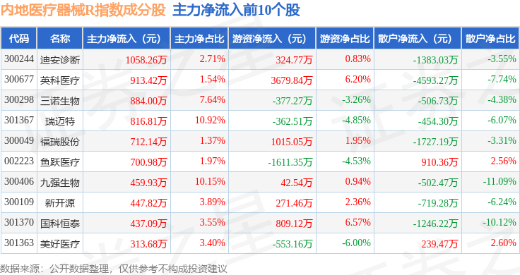 资金流向方面,内地医疗器械R(483103)指数成份股当日主力资金净流出合计5363.93万元,游资资金净流出合计1154.01万元,散户资金净流入合计6517.94万元。成份股资金流向详情见下表:
