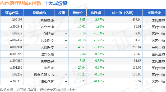 内地医疗器械R(483103)指数十大成份股详情如下: