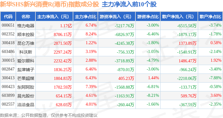 资金流向方面,新华SHS新兴消费R(港币)(489007)指数成份股当日主力资金净流出合计3.82亿元,游资资金净流出合计1.47亿元,散户资金净流入合计5.28亿元。成份股资金流向详情见下表: