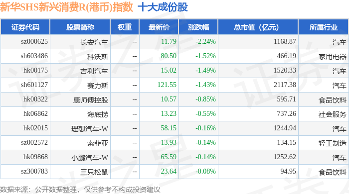 新华SHS新兴消费R(港币)(489007)指数十大成份股详情如下: