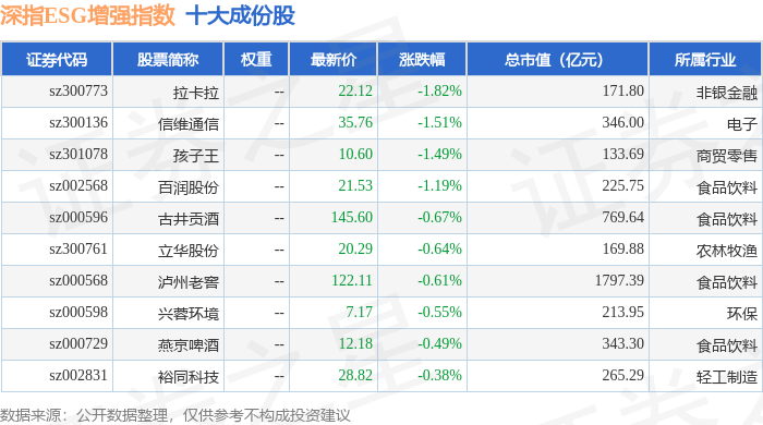 证券之星消息,12月17日,深指ESG增强(970032)指数报收于1569.59点,涨2.12%,成交2452.64亿元,换手率1.32%。当日该指数成份股中,上涨的有176家,光迅科技以10.01%的涨幅领涨,下跌的有20家,拉卡拉以1.82%的跌幅领跌。