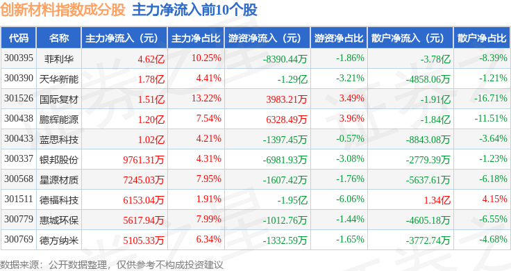 资金流向方面,创新材料(970039)指数成份股当日主力资金净流入合计4.81亿元,游资资金净流出合计4.03亿元,散户资金净流出合计7813.26万元。成份股资金流向详情见下表: