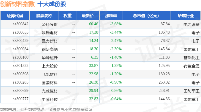 创新材料(970039)指数十大成份股详情如下:
