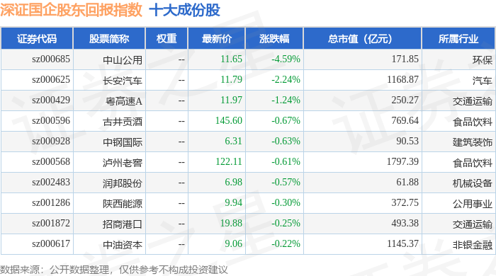 深证国企股东回报(970064)指数十大成份股详情如下: