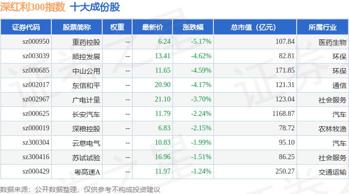 证券之星消息,12月17日,深红利300(970062)指数报收于5500.33点,涨1.07%,成交1668.85亿元,换手率1.47%。当日该指数成份股中,上涨的有252家,东方铁塔以10.03%的涨幅领涨,下跌的有42家,重药控股以5.17%的跌幅领跌。