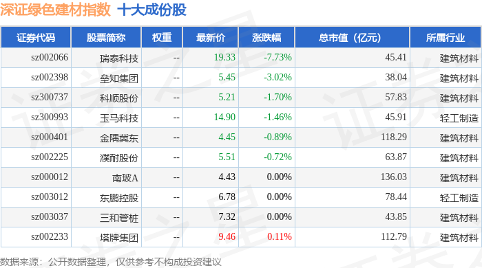 证券之星消息,12月17日,深证绿色建材(970077)指数报收于1338.07点,涨0.65%,成交77.7亿元,换手率1.99%。当日该指数成份股中,上涨的有21家,中材科技以5.5%的涨幅领涨,下跌的有6家,瑞泰科技以7.73%的跌幅领跌。