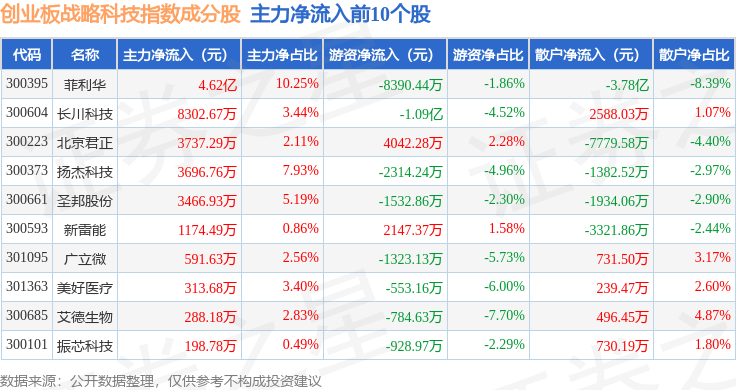 资金流向方面,创业板战略科技(971004)指数成份股当日主力资金净流出合计4.8亿元,游资资金净流出合计1.95亿元,散户资金净流入合计6.74亿元。成份股资金流向详情见下表: