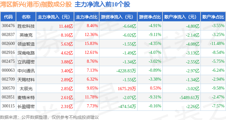 资金流向方面,湾区新兴(港币)(980008)指数成份股当日主力资金净流入合计47.96亿元,游资资金净流出合计28.72亿元,散户资金净流出合计19.24亿元。成份股资金流向详情见下表: