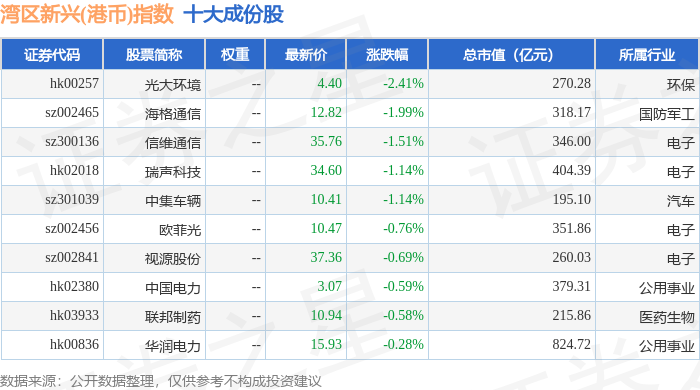 湾区新兴(港币)(980008)指数十大成份股详情如下: