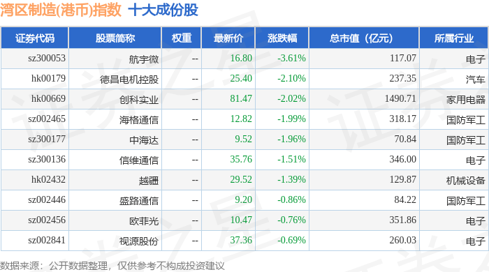 湾区制造(港币)(980010)指数十大成份股详情如下: