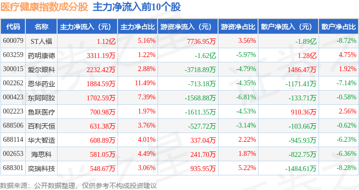 资金流向方面,医疗健康(980016)指数成份股当日主力资金净流出合计4.95亿元,游资资金净流出合计3.6亿元,散户资金净流入合计8.56亿元。成份股资金流向详情见下表: