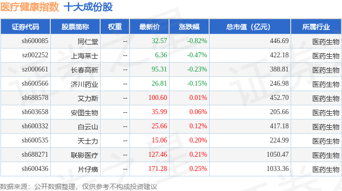 医疗健康(980016)指数十大成份股详情如下: