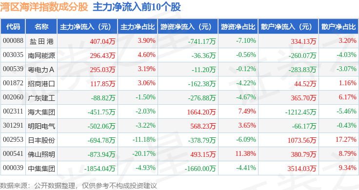 资金流向方面,湾区海洋(980019)指数成份股当日主力资金净流出合计1.95亿元,游资资金净流出合计213.63万元,散户资金净流入合计1.98亿元。成份股资金流向详情见下表: