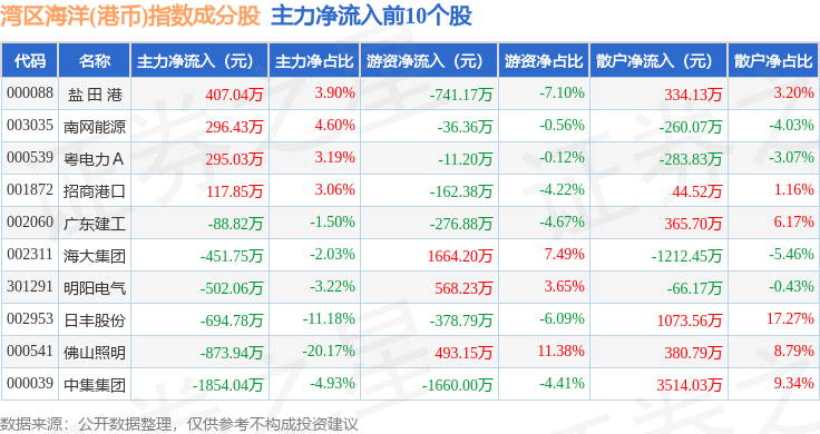 资金流向方面,湾区海洋(港币)(980020)指数成份股当日主力资金净流出合计1.95亿元,游资资金净流出合计213.63万元,散户资金净流入合计1.98亿元。成份股资金流向详情见下表: