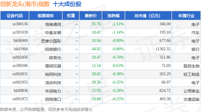 创新龙头(港币)(980037)指数十大成份股详情如下: