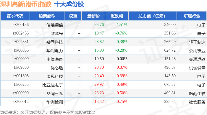 深圳高新(港币)(980039)指数十大成份股详情如下: