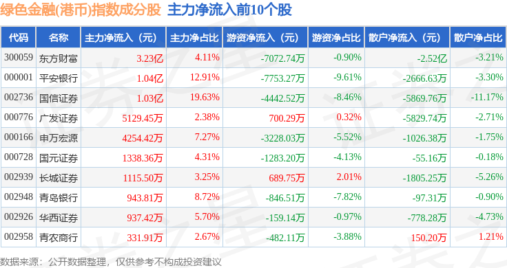 资金流向方面,绿色金融(港币)(980053)指数成份股当日主力资金净流入合计6.11亿元,游资资金净流出合计1.95亿元,散户资金净流出合计4.16亿元。成份股资金流向详情见下表: