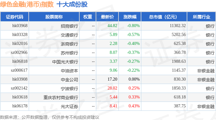 绿色金融(港币)(980053)指数十大成份股详情如下: