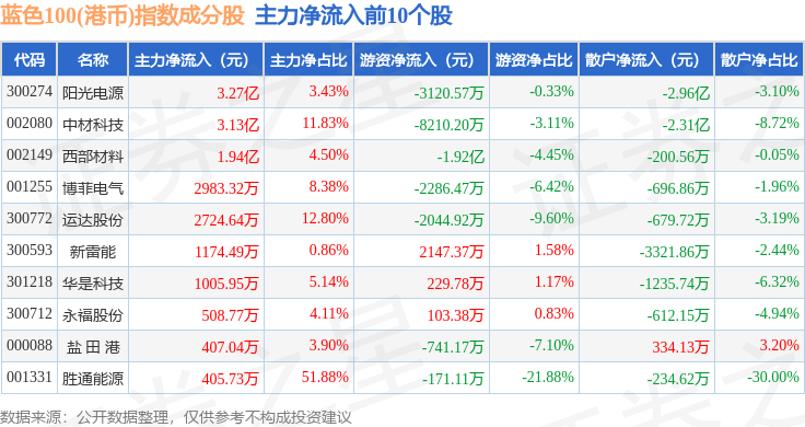 资金流向方面,蓝色100(港币)(980069)指数成份股当日主力资金净流出合计5.6亿元,游资资金净流出合计4.2亿元,散户资金净流入合计9.8亿元。成份股资金流向详情见下表:
