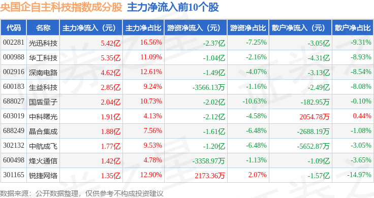 资金流向方面,央国企自主科技(980083)指数成份股当日主力资金净流入合计17.08亿元,游资资金净流出合计12.48亿元,散户资金净流出合计4.61亿元。成份股资金流向详情见下表: