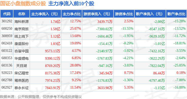 资金流向方面,国证小盘(980202)指数成份股当日主力资金净流出合计22.22亿元,游资资金净流入合计6315.41万元,散户资金净流入合计15.38亿元。成份股资金流向详情见下表: