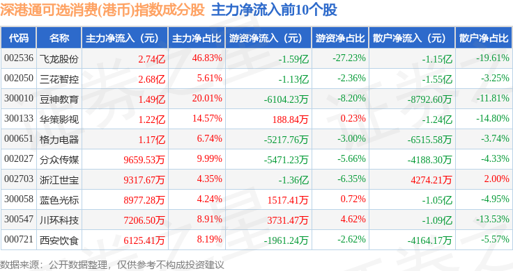 资金流向方面,深港通可选消费(港币)(983020)指数成份股当日主力资金净流出合计6.3亿元,游资资金净流出合计5.21亿元,散户资金净流入合计11.51亿元。成份股资金流向详情见下表: