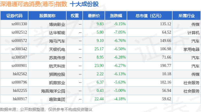 深港通可选消费(港币)(983020)指数十大成份股详情如下: